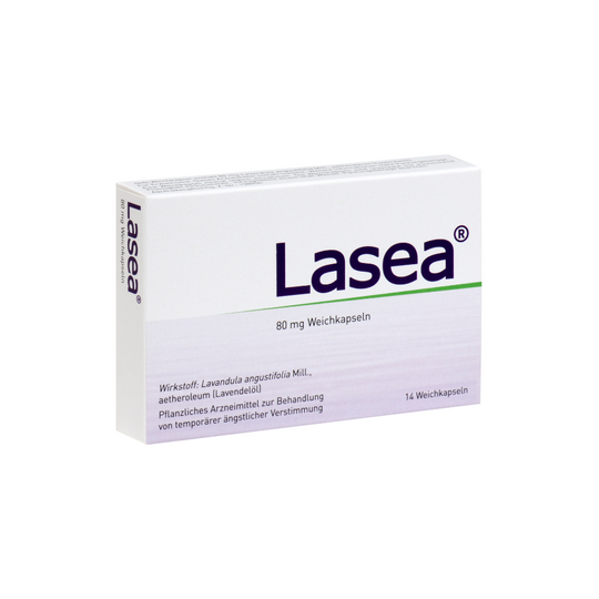 Produktdetails & Pflichtangaben Lasea® 80mg Weichkapseln sind ein pflanzliches Arzneimittel, das zur Behandlung von Unruhezuständen bei ängstlicher Verstimmung eingesetzt wird. Der Wirkstoff in Lasea® ist hochdosiertes Lavendelöl, das aus der Lavendelpflanze (Lavandula angustifolia) gewonnen wird. Lavendelöl...Regulärer Preis Ab €8,58