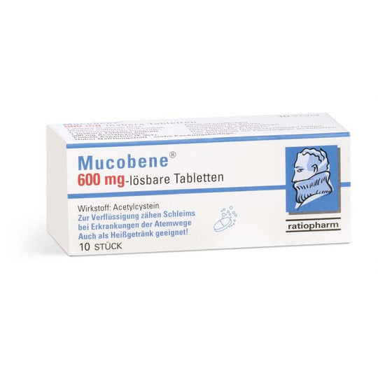 Produktdetails & Pflichtangaben Mucobene® 600 mg ist ein mukolytisches Arzneimittel, das zur Behandlung von Atemwegserkrankungen mit zähem Schleim eingesetzt wird. Die löslichen Tabletten enthalten den Wirkstoff Acetylcystein, der die Schleimviskosität verringert und somit das Abhusten erleichtert....Regulärer Preis €4,79 -