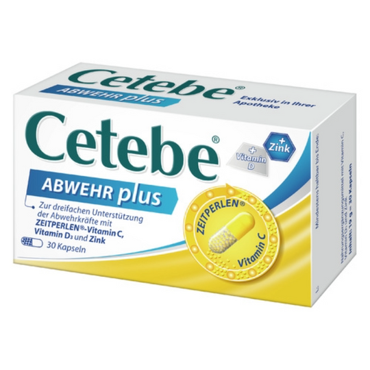 CETEBE ABWEHR PLUS KPS 30ST unterstützt das Immunsystem mit Vitamin C, Zink und Selen. Bezeichnung:Nahrungsergänzungsmittel mit Vitamin C, Vitamin D3 und ZinkVerwendung/Anwendung/Verzehrempfehlung:Zur Nahrungsergänzung täglich 1 Kapsel mit reichlich Flüssigkeit schlucken.Nährwertdeklaration: Nährstoffe pro Kapsel % der empfohlenen...Regulärer Preis Ab €15,25